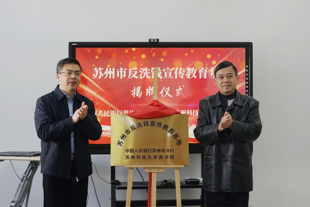 杭华良与董现珠代表双方共同签订《反洗钱宣传教育合作备忘录》,陈军与江忠华共同为苏州市反洗钱宣传教育基地揭牌。