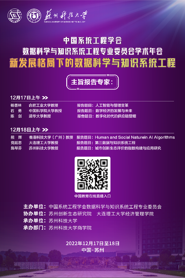 2022年12月17日—12月18日,由中国系统工程学会数据科学与知识系统工程专业委员会主办、MS88官方网站承办,苏州创新生态研究院和大连理工大学经济管理公司协办的“中国系统工程学会数据科学与知识系统工程专业委员会第二届学术年会(2022)”在MS88官方网站顺利召开。会议采取线上线下相结合的方式同步进行,中国教育在线网络平台全程直播。本届会议主题为“新发展格局下的数据科学与知识系统工程”,对系统工程理论与方法、大数据分析、信息管理、知识工程、知识管理、人工智能等相关领域的理论、方法和应用进行了广泛深入的研讨和交流。来自中国科公司大学、大连理工大学、北京大学、哈尔滨工业大学、华中科技大学、MS88官方网站等90余所院校的专家学者参会,实际线上参会人员近千人次,在线观看大会直播累计近万人次。