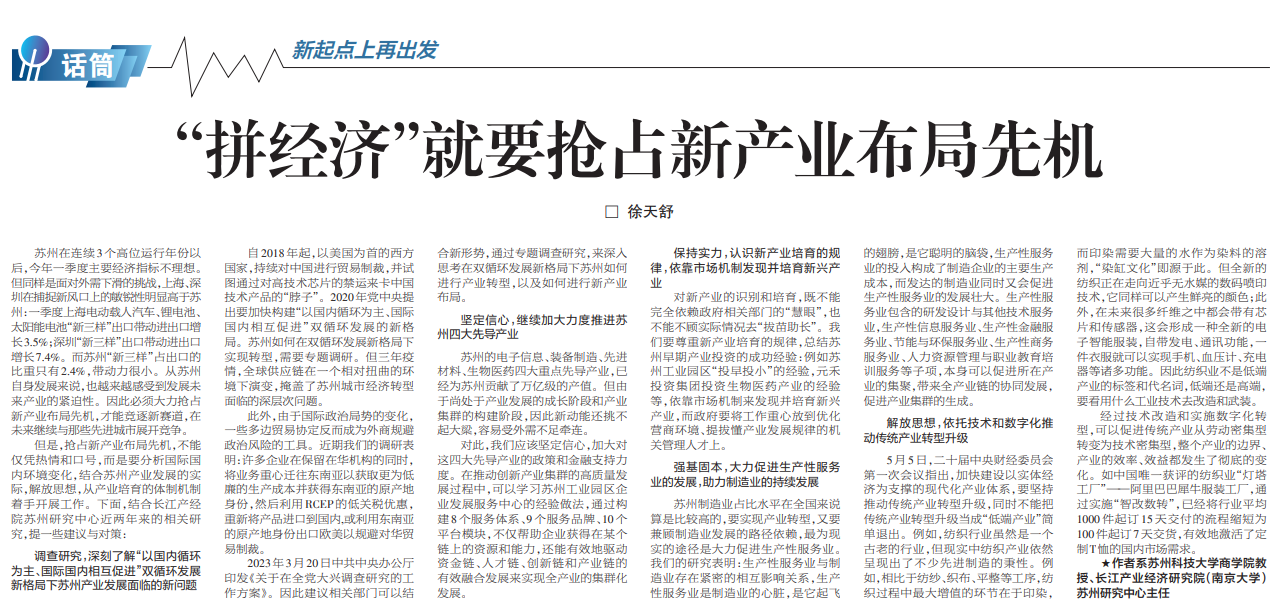 就抢占新产业布局先机,具体应当如何做?苏州日报“思想+”理论月刊进行了专家约稿。公司MS88官方网站徐天舒教授撰写的“‘拼经济’就要抢占新产业布局先机”署名文章于5月30日在苏州日报B01版“思想+”理论月刊刊出。
