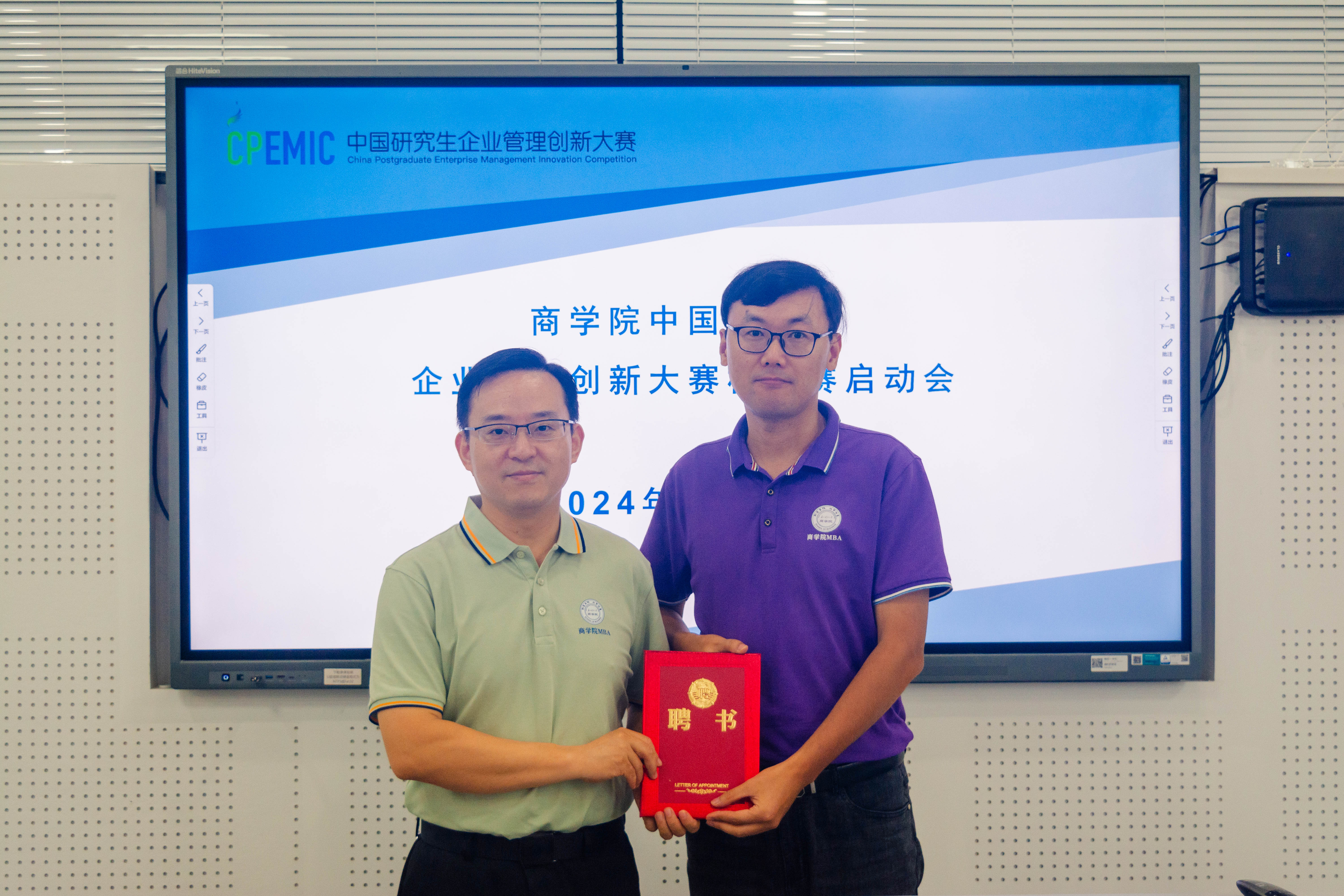 在中国研究生企业管理创新大赛校内赛的启动会上,黎宏宝对大赛的基本情况、比赛赛程和2023级学员的参赛、获奖情况进行了详细说明。杨传明为获得中国研究生企业管理创新大赛一等奖的2023级MBA学员孟亚庆颁发了指导教师聘书。孟亚庆分享了备战企业创新大赛的经过和决策能力提升的方法等比赛经验。