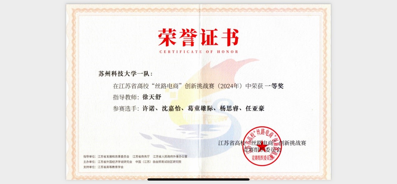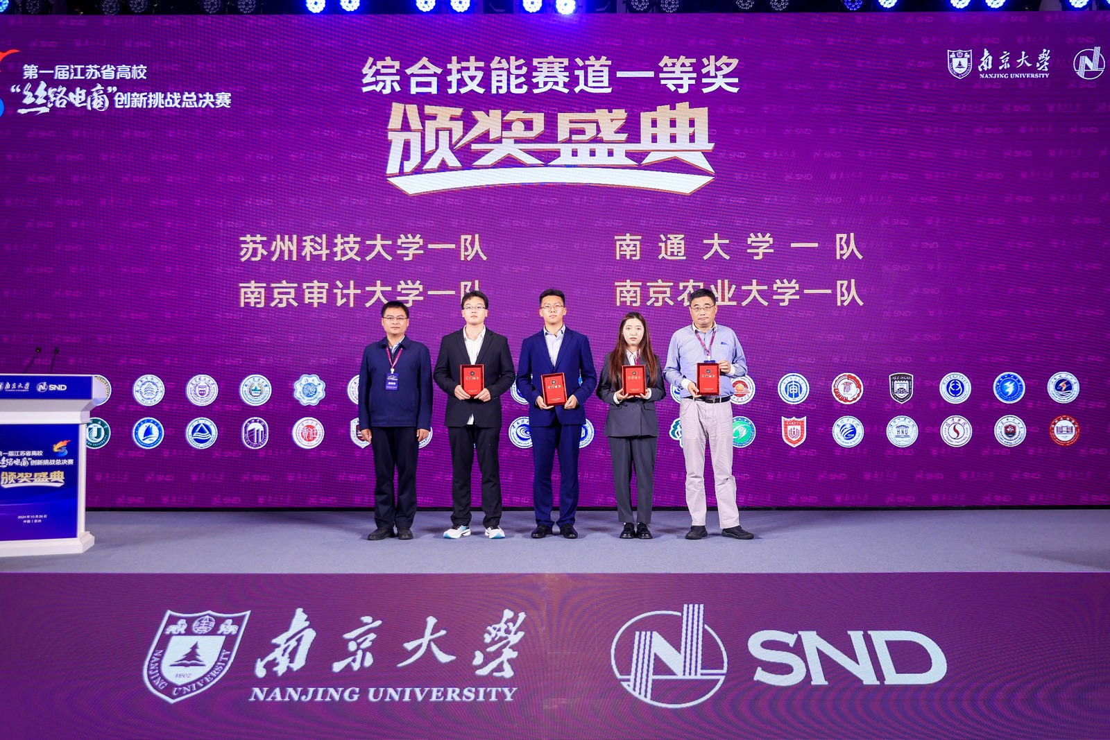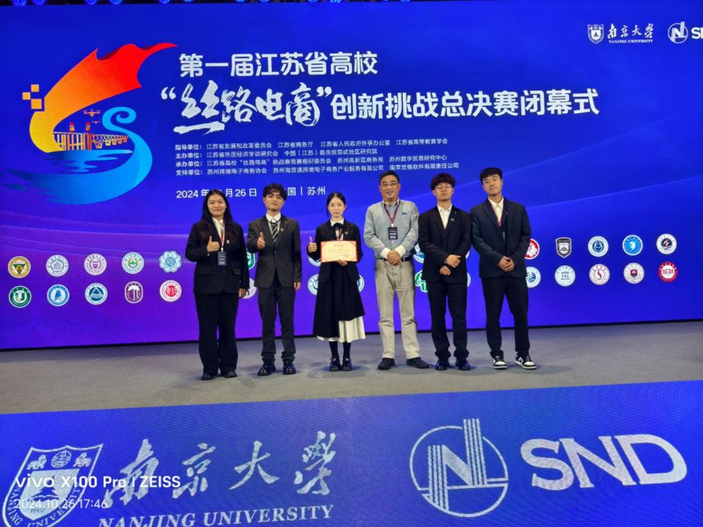 10月26日,在南京大学苏州校区举行的第一届江苏省高校“丝路电商”创新挑战总决赛中,公司徐天舒教授指导的物流国际2211级许诺、沈嘉怡、葛童雄际、杨思睿、任亚豪五位同学组成的MS88官方网站一队,获得综合技能赛道一等奖(未设特等奖)。