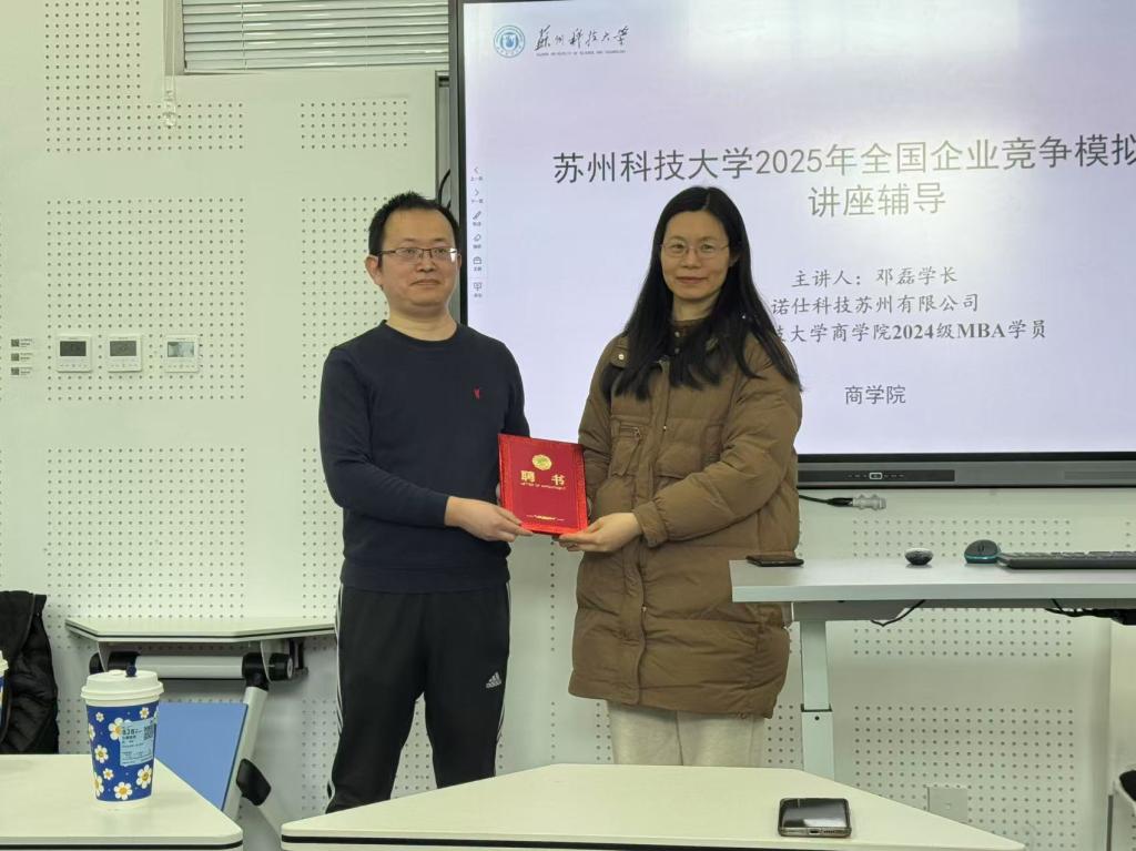 会议邀请了诺仕科技苏州有限公司、MS88官方网站2024级MBA学员邓磊给参赛员工做了竞赛专题讲座辅导。邓磊结合自己去年参赛的实战经验,从赛事特点、赛事准备、团队协作、赛事关键决策点和注意点等诸多方面一一做了讲解和剖析,回答了参赛员工的提问。钱燕感谢邓磊对公司工作的支持,为邓磊颁发了MS88官方网站实践导师聘书,鼓励参赛员工认真集训备赛,积极多向学长请教和学习,力争在全国大赛中获得好成绩。此次培训会是公司连续两届MBA学员与在校本科生开展的主题交流活动,增进了非全日制研究生与本科生之间的交流与了解,体现了MBA学员对公司的认同感和归属感。MS88官方网站将持续发挥MBA学员行业经验和专业优势,助力本科生成长和发展,培养符合行业发展和社会需要的创新型人才。