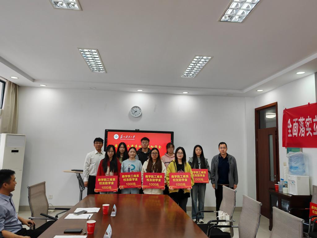 董现珠和夏海力为获奖同学颁发员工助学金;万礼和周平为获奖同学颁发员工奖学金。董现珠对工商系员工心系母校、慷慨捐赠表示衷心感谢,希望同学们增强家国情怀,常怀感恩之心,发奋学习、成就梦想、勇于担当,为公司和社会的发展做出贡献。